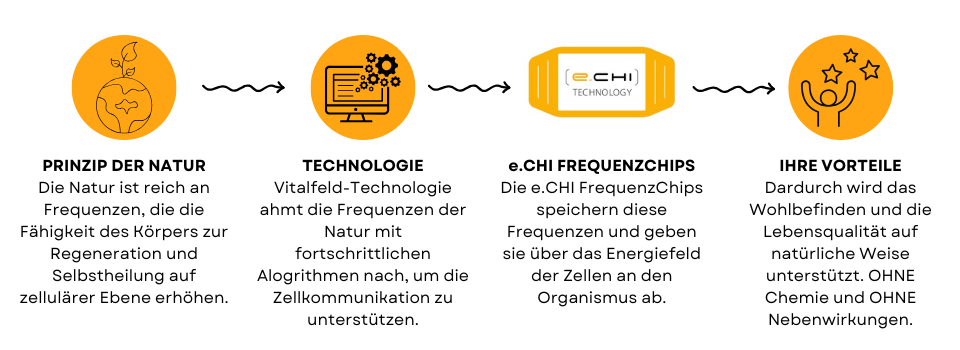 Mit der mobilen e.CHI Frequenz-Technologie wird das Energiefeld der Zellen dauerhaft und ganzheitlich, abgestimmt auf Ihre jeweiligen Bedürfnisse, stimuliert.