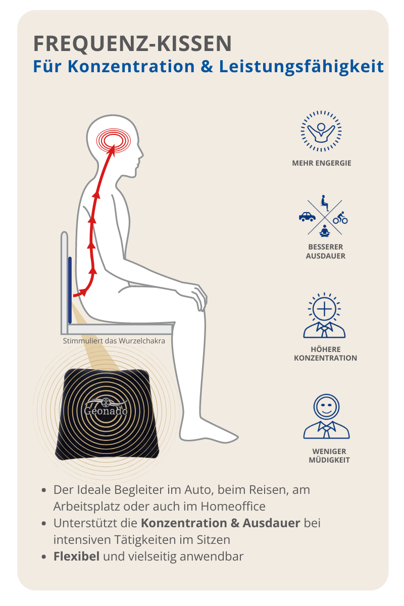 Im Frequenz-Kissen ist der patentierte Geonado Frequenz-Chip integriert, der mit speziellen Frequenzen gespeichert ist, um bei Konzentration und Belastungen zu unterstützen. Dabei wird das Wurzelchakra stimuliert und die positiven Effekte werden auf den Organismus übertragen.